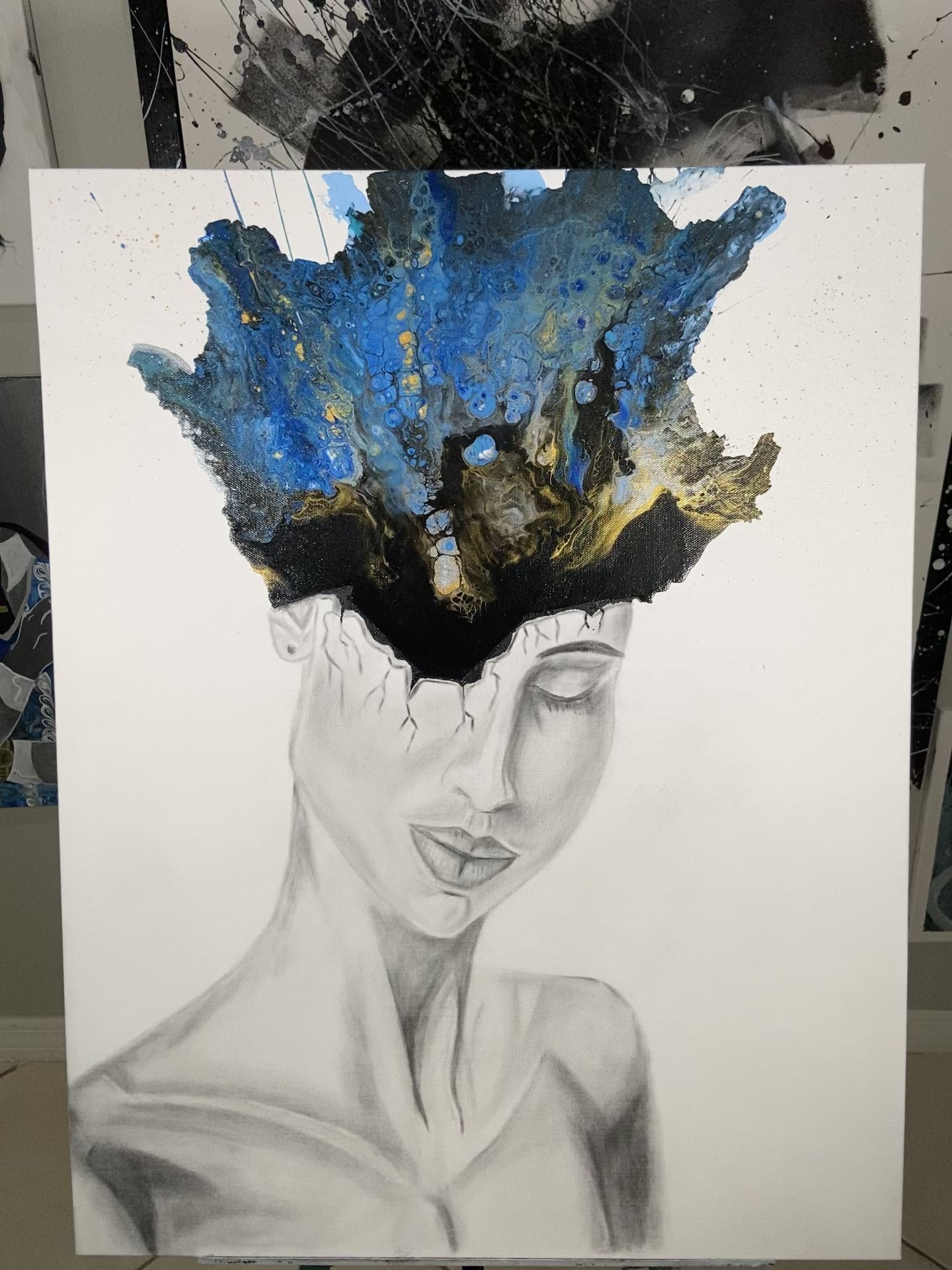 Acrylic Paint and Loose Charcoal Portrait on White Canvas